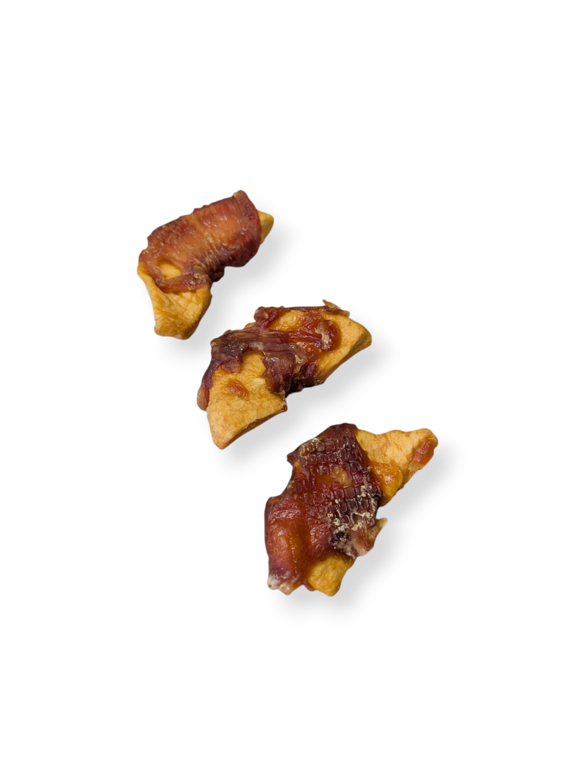 These apple wrapped in chicken treats are the perfect blend of sweet and savoury—juicy apple slices lovingly wrapped in strips of real chicken breast. They’re light, low in fat, and bursting with natural goodness, making them ideal for health-conscious hounds and fussier pups alike.