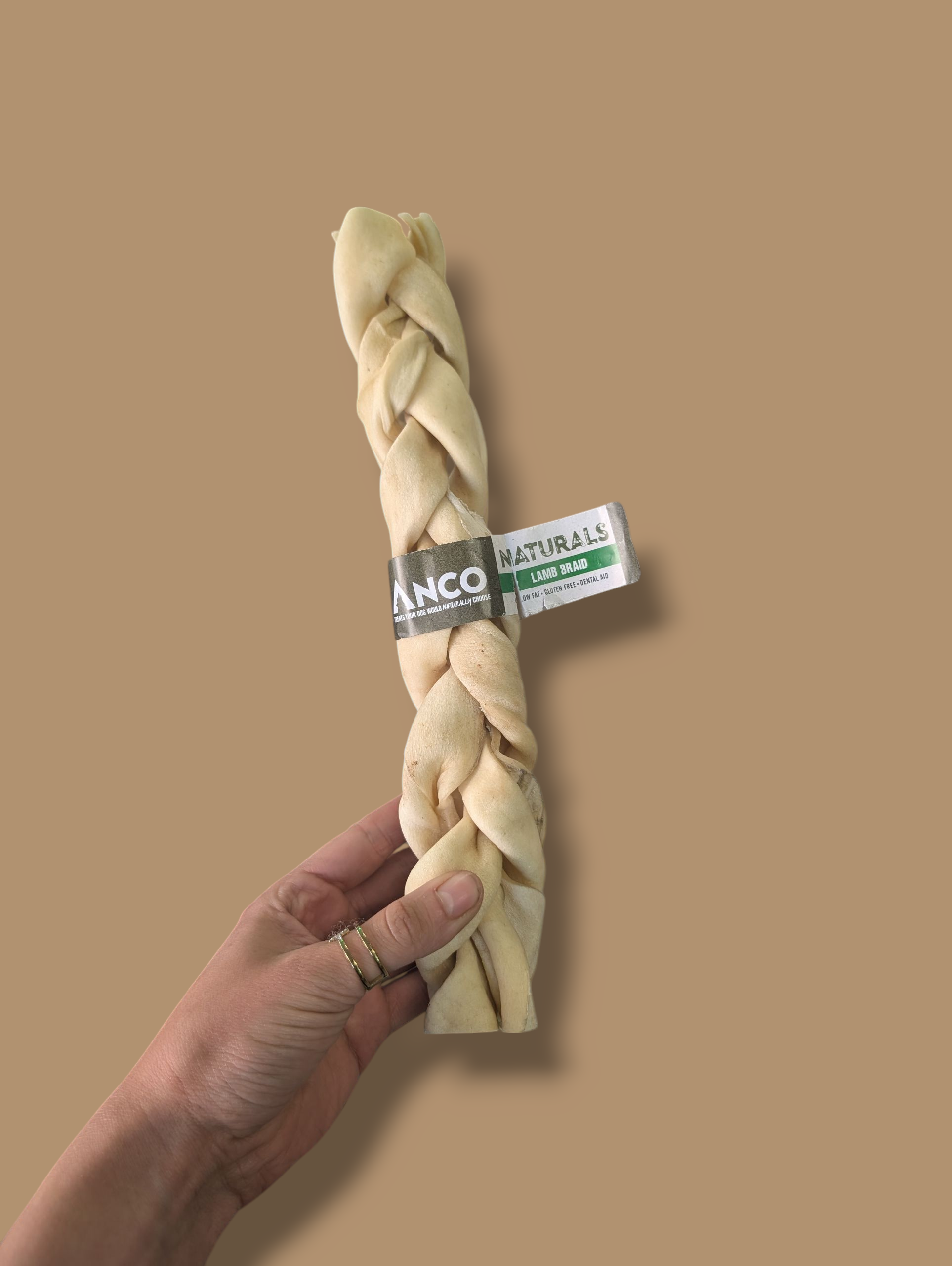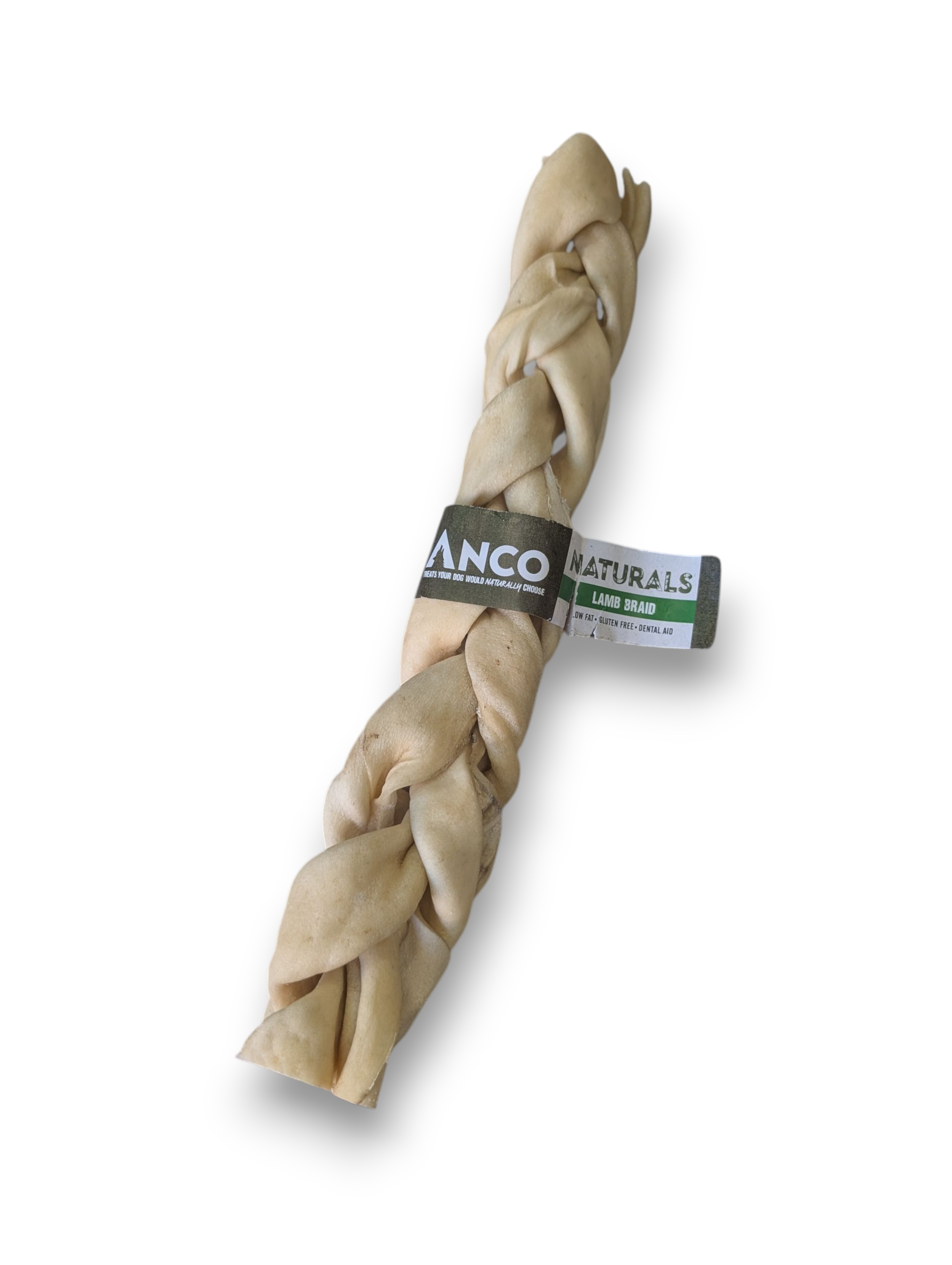 Anco Lamb Braids Large are made from 100% Lamb skin that has been braided together, making it slightly more durable and adding an extra element of excitement - more for the dog to chew and tear apart! Due to the size, they are also longer lasting than our smaller braids so if you have a larger breed or a keen/strong chewer, these may be a better option. The chewing of the braids will also help promote dental health by reducing plaque and tartar build up. These braids go down a treat, due to their size they are perfect to snack on in between meals or for after a walk to provide some chilled out chewing time as a reward for their good behaviour.
