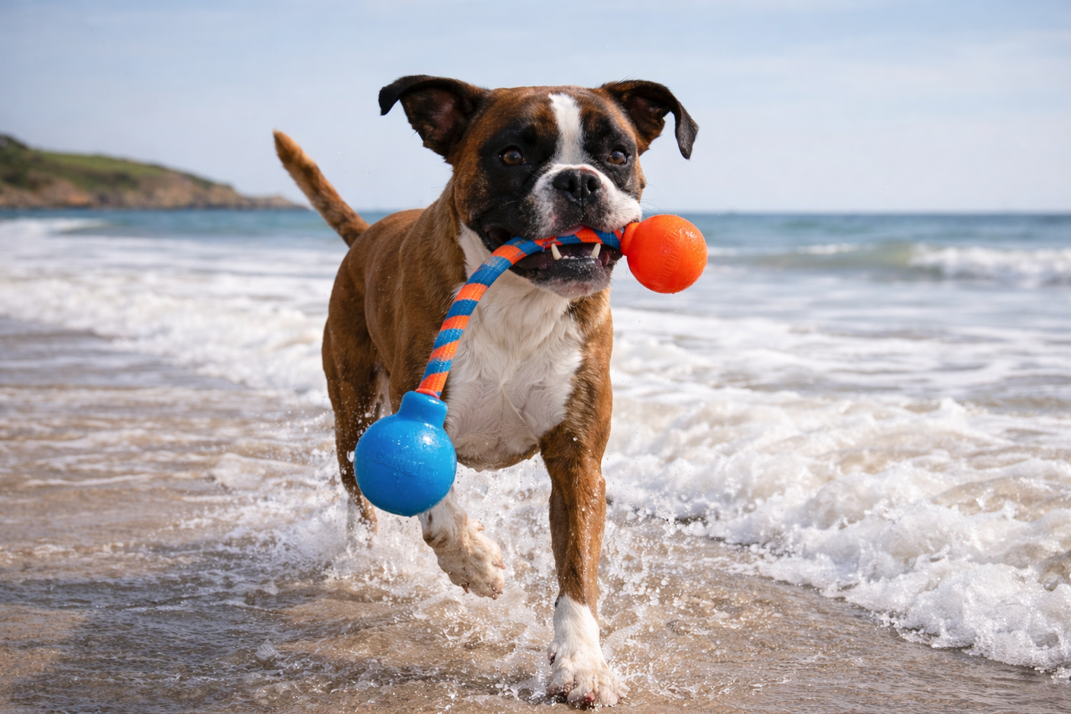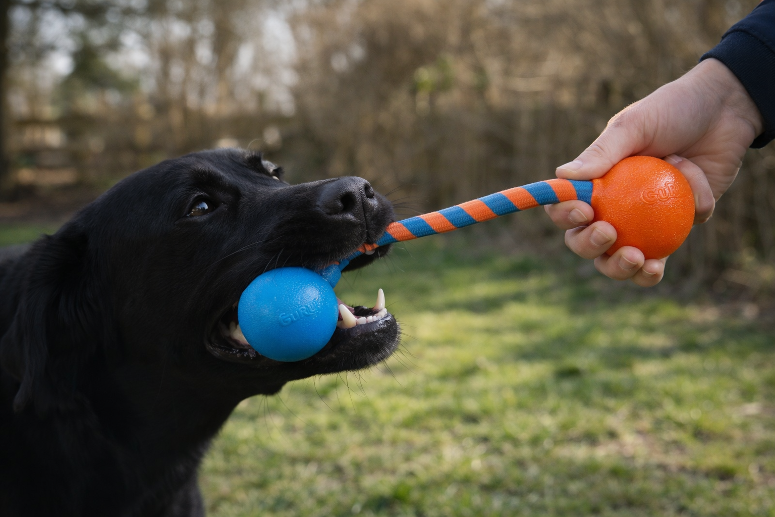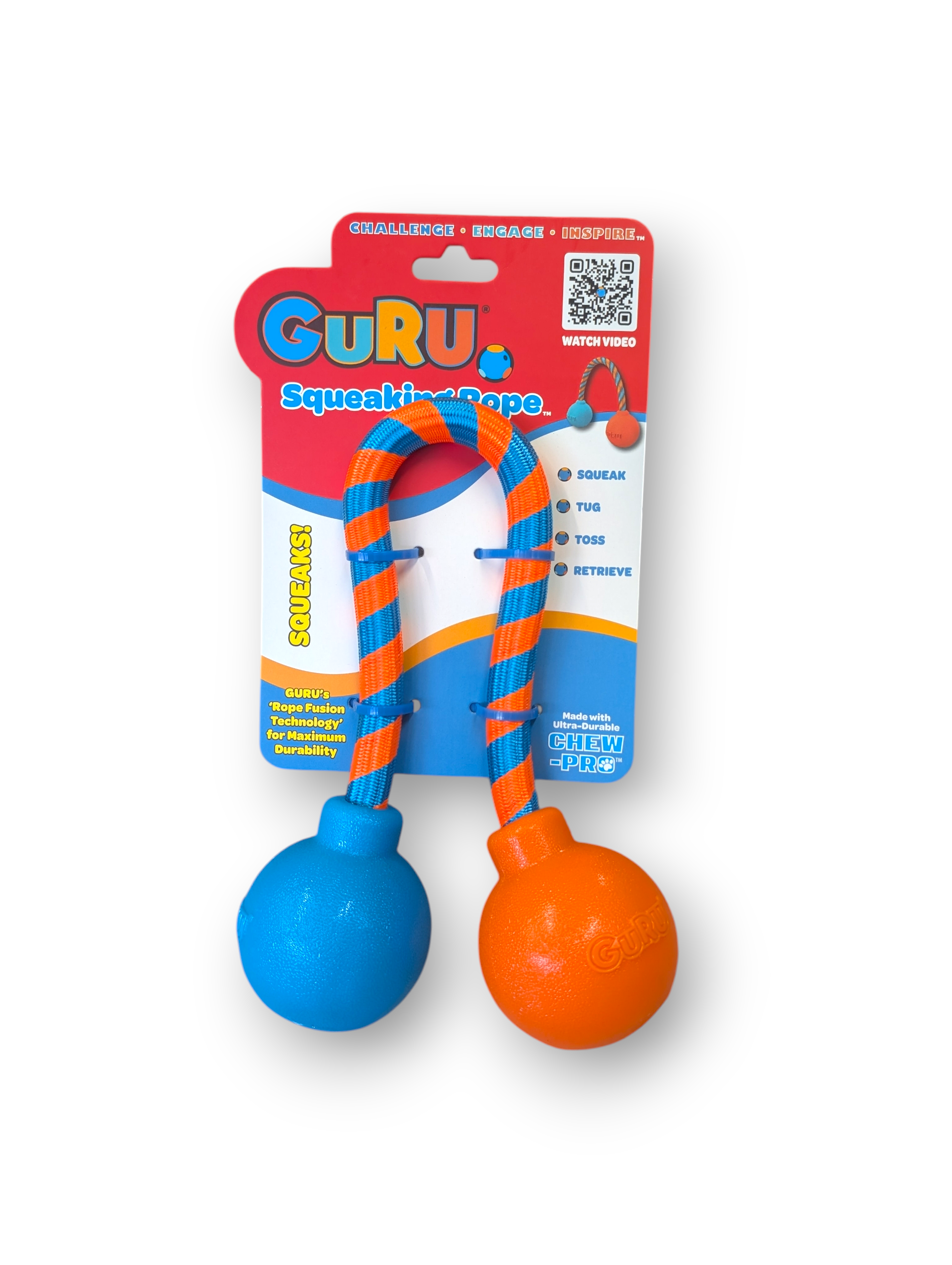 - Overmolded squeaker balls are fused to the rope, making it carriable