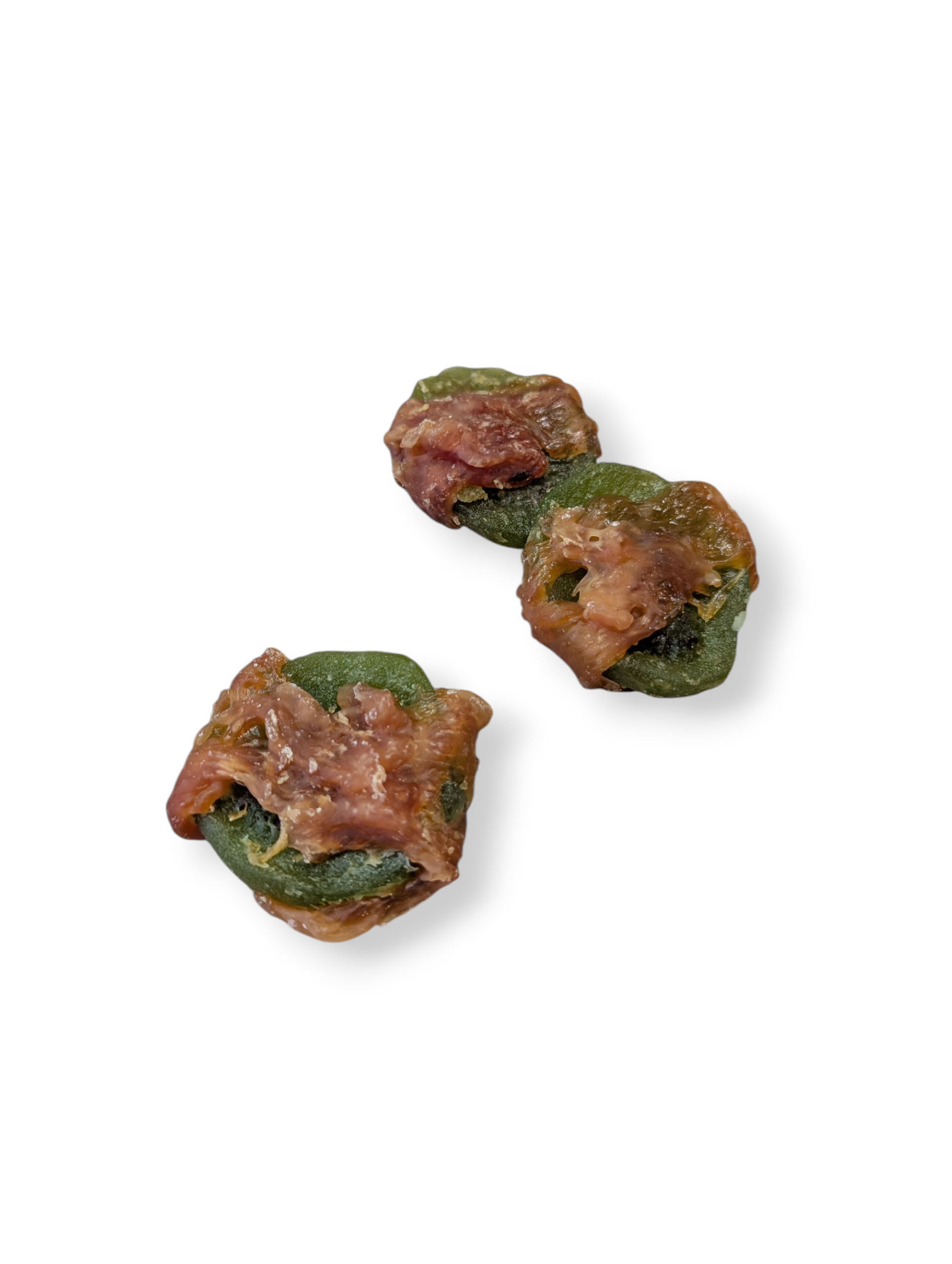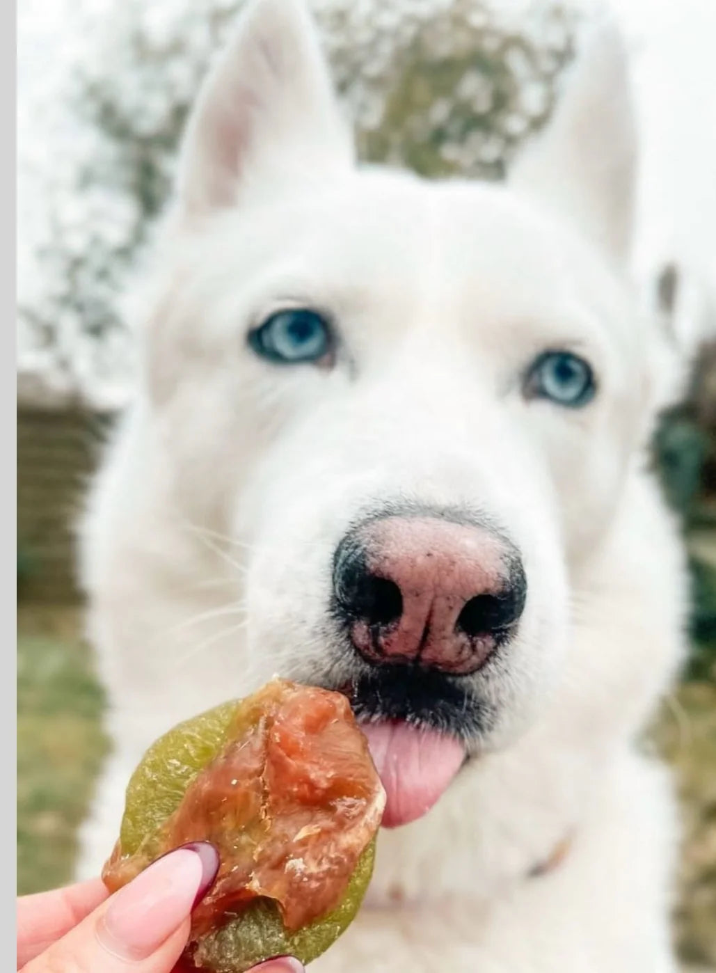 These kiwi wrapped in chicken treats are a refreshing mix of fruity zing and savoury goodness—real kiwi slices wrapped in lean chicken breast for a unique, chewy snack your dog will go wild for. Perfect for pups who love a bit of flavour adventure!