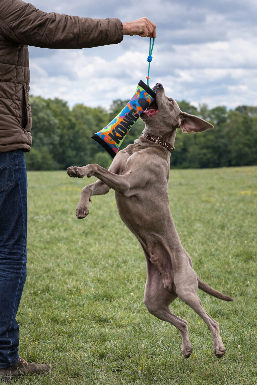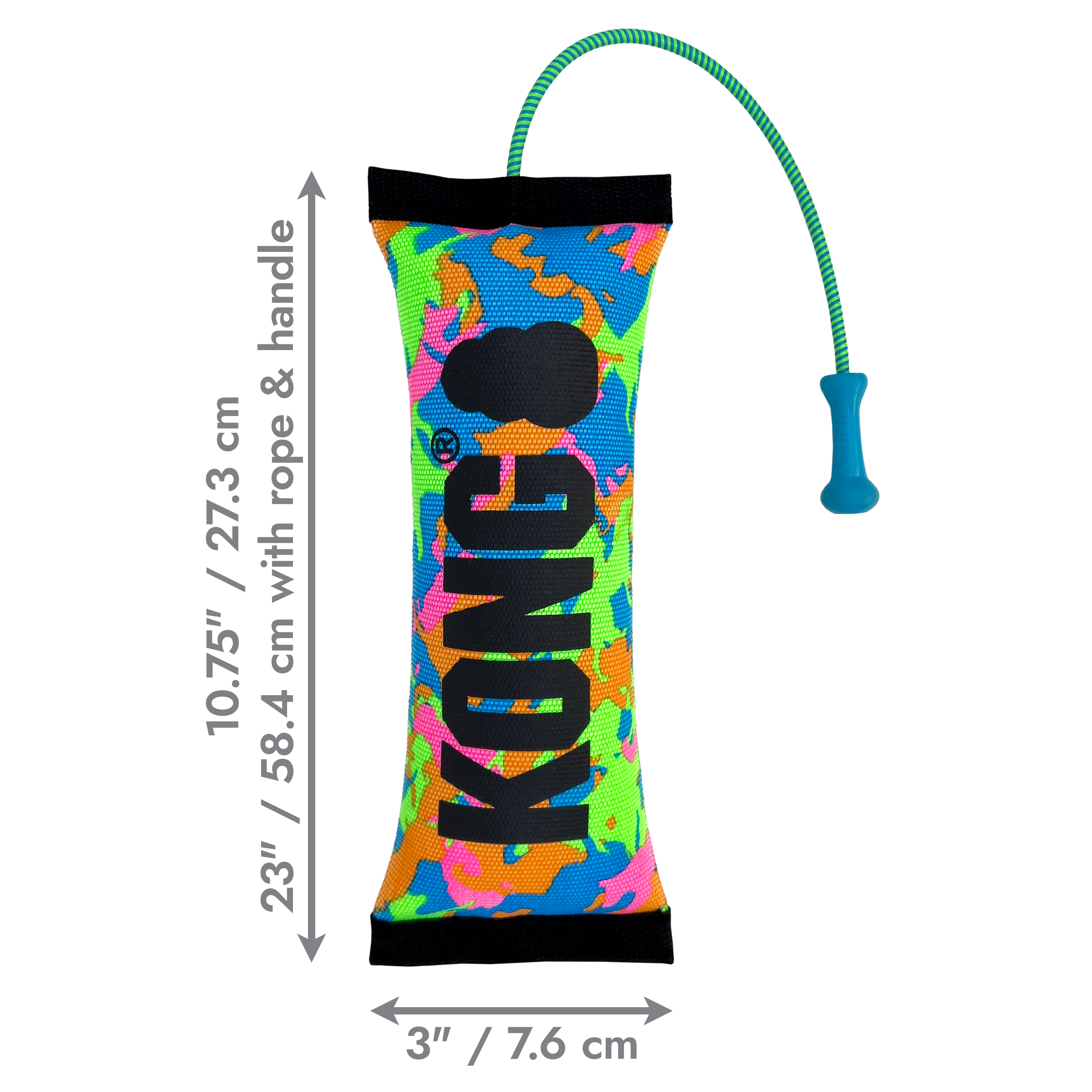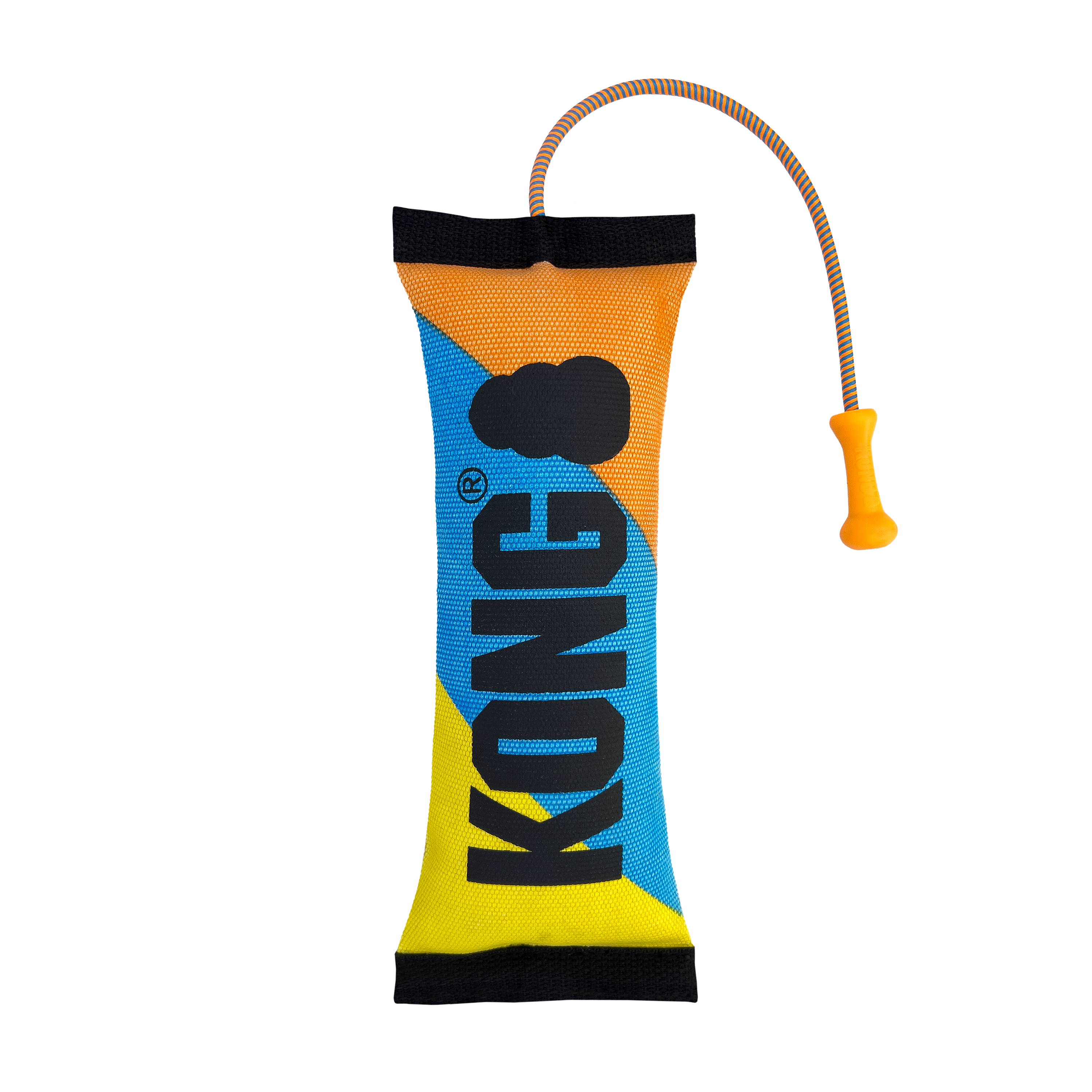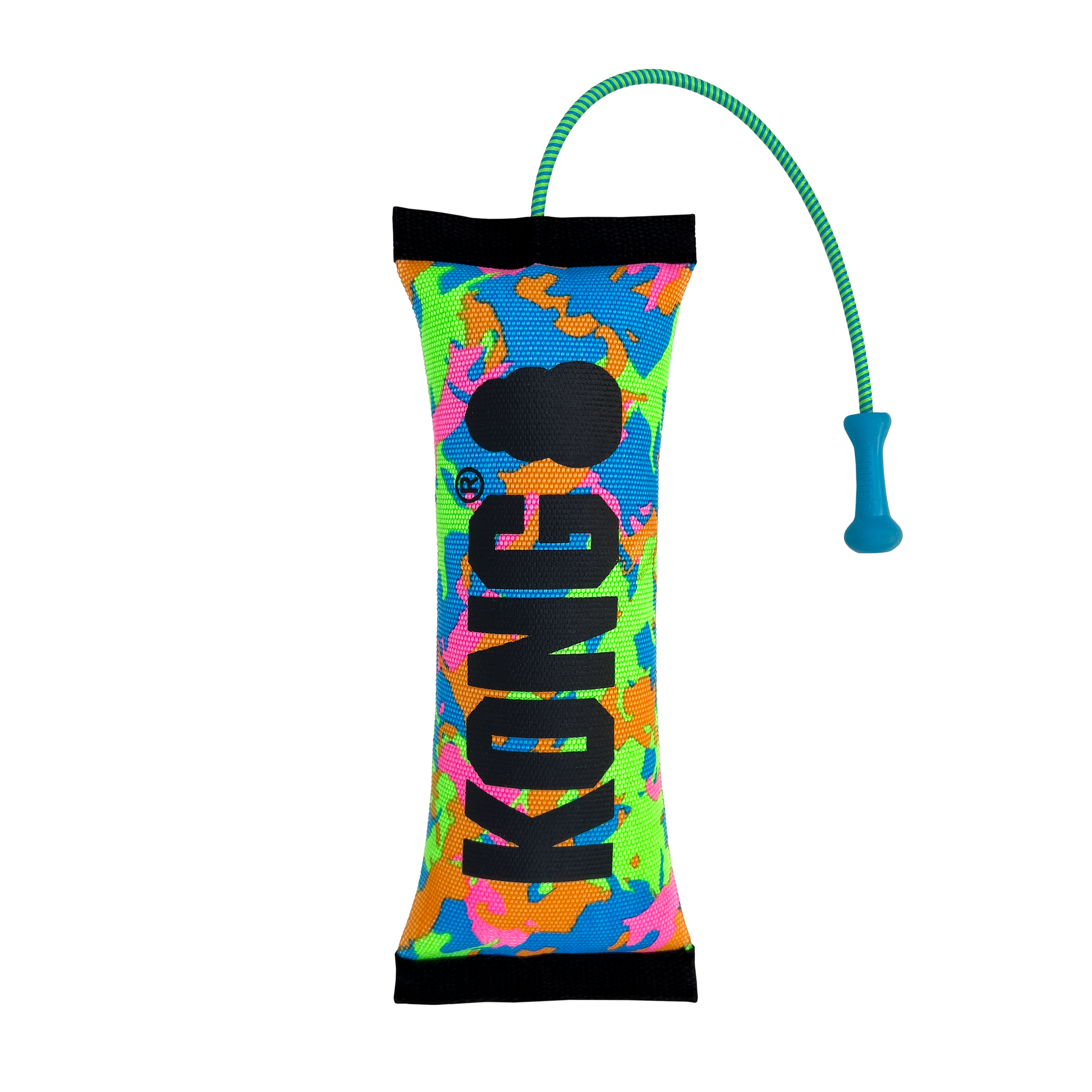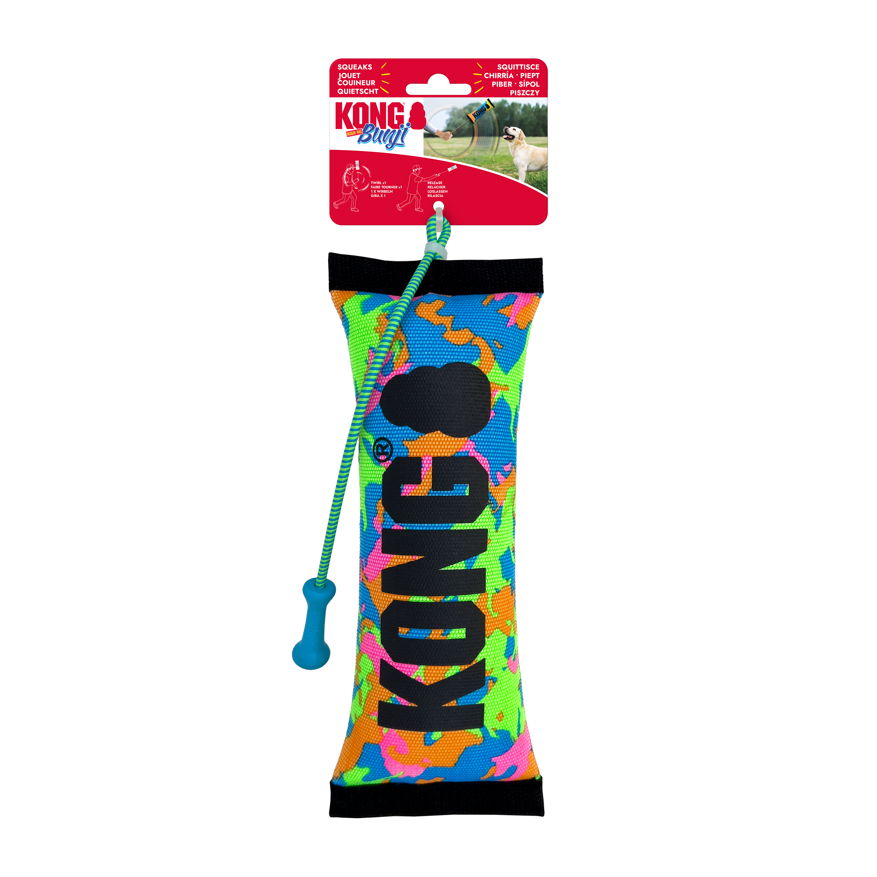 Keep fetch sessions exciting and easy with the KONG Bunji High-Viz Bumper. First of all, its bright colours and patterns stand out anywhere. Thanks to the heavy-duty firehose material, it's built for energetic play. What's more, the bungee rope saves your shoulder during long throws. As your dog retrieves this bumper, they'll love the engaging squeak that taps into their natural instincts.
