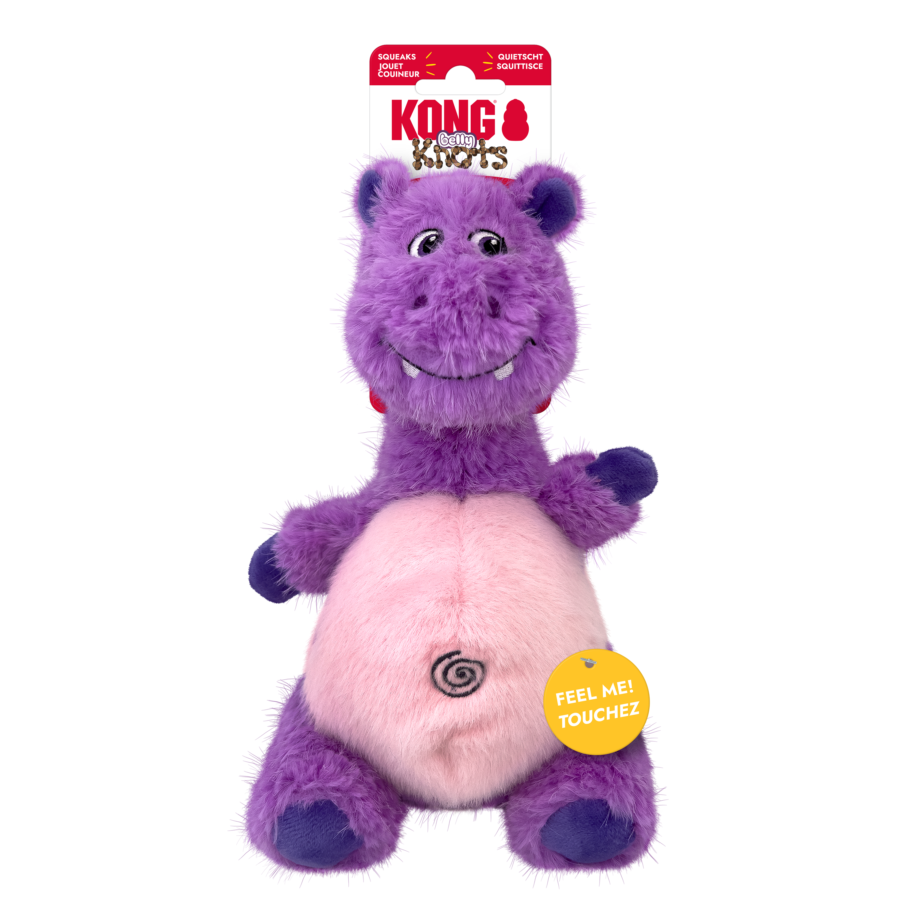 Meet the KONG Knots Belly Hippo, it's ready for wild games and cosy naps! This adorable purple hippo combines a soft, cuddly exterior with a surprise inside: a sturdy, weighted rope ball that gives it a satisfying heft. Watch as your dog discovers the joy of thrashing and flinging their new friend around, thanks to the enticing weight and movement of the internal rope skeleton. When playtime winds down, the plush exterior becomes the perfect snuggle companion. With an exciting squeaker in the head to pique their curiosity, this hippo is ready for whatever mood your pup is in!