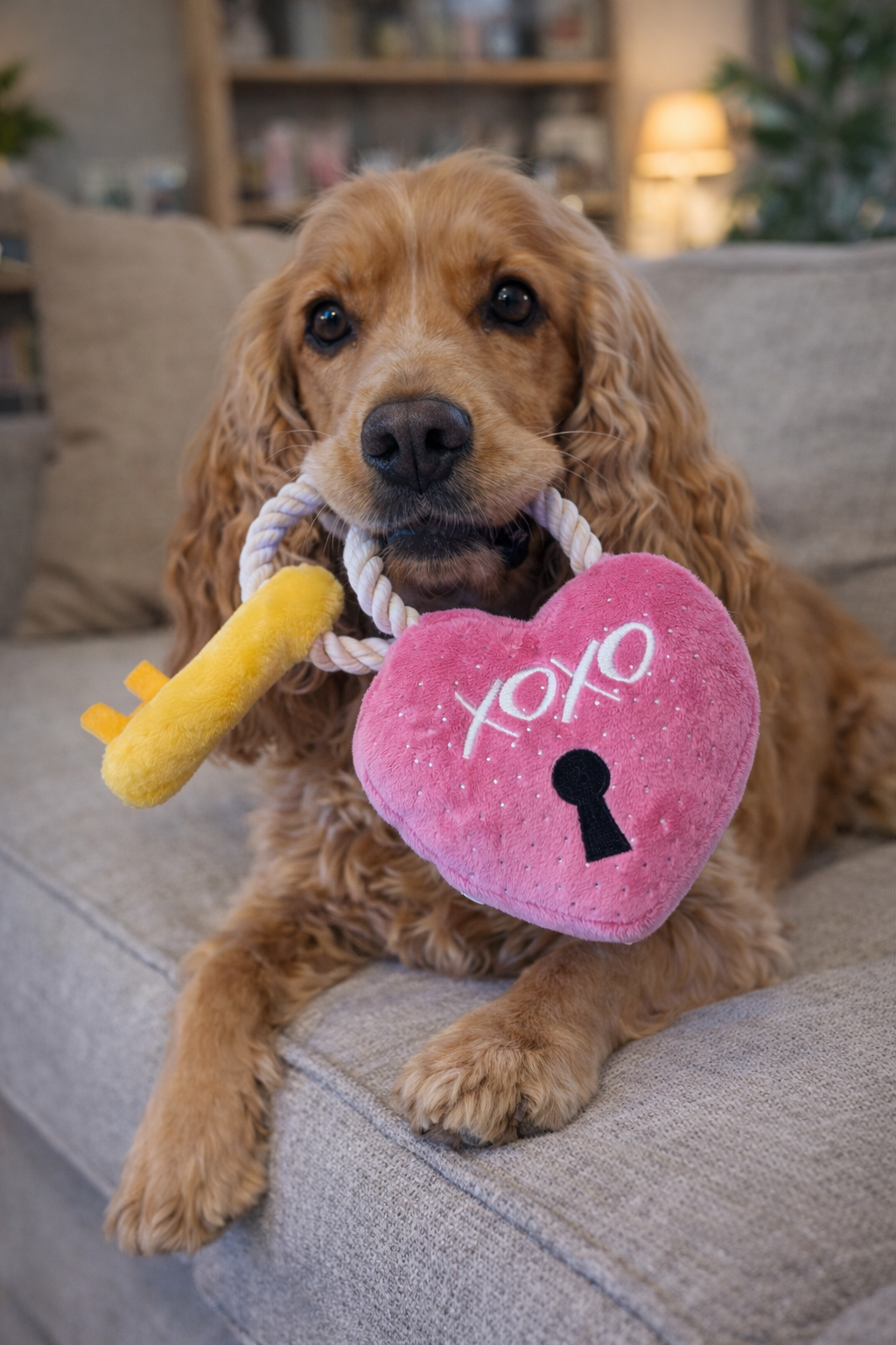 From the P.L.A.Y. Love Bug collection, we bring you this adorable love heart lock and key soft dog toy, perfect for Valentine's Day or just to show how much you adore your pooch. Woof! As well as looking cute, your dog will adore the soft textures, squeaker and crinkle features of this gorgeous toy. A delightful way to celebrate your connection with your furry friend.
