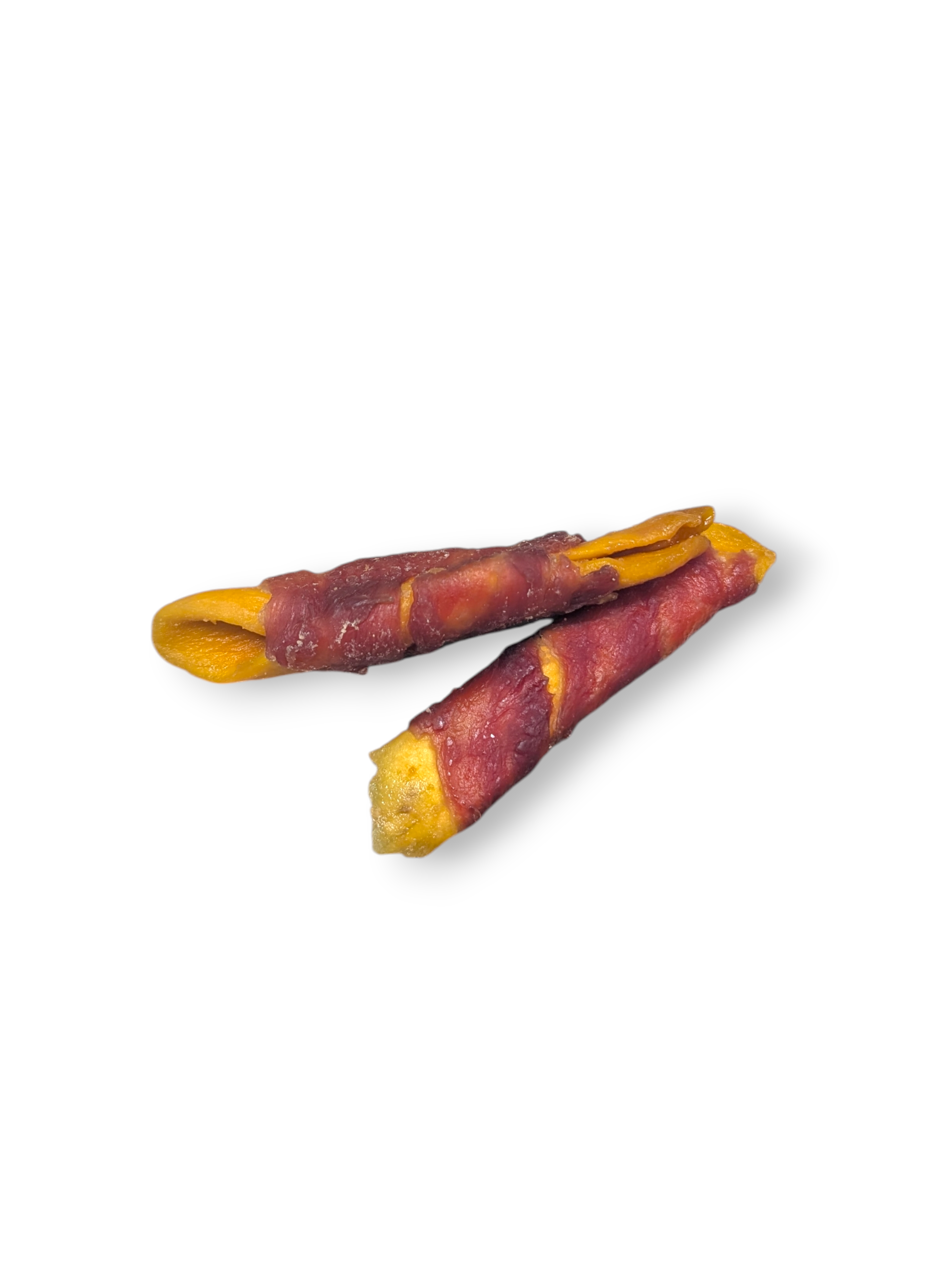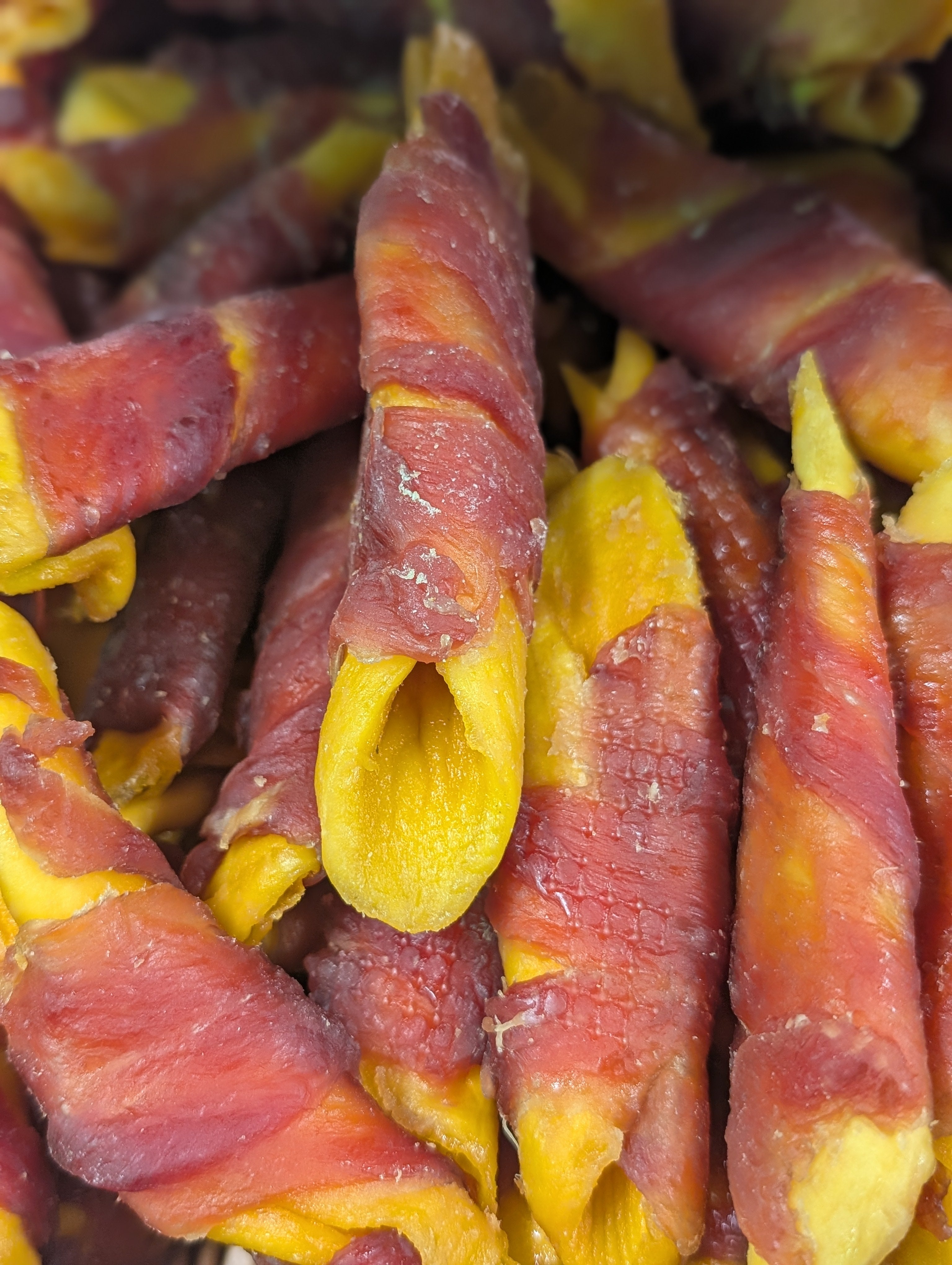 These mango wrapped in duck treats are a tropical-meets-meaty masterpiece—sweet, tender mango slices wrapped in rich duck breast for a chewy snack that’s bursting with flavour. Perfect for pups who like their treats with a bit of flair.